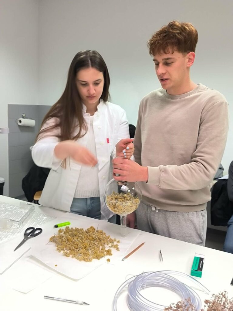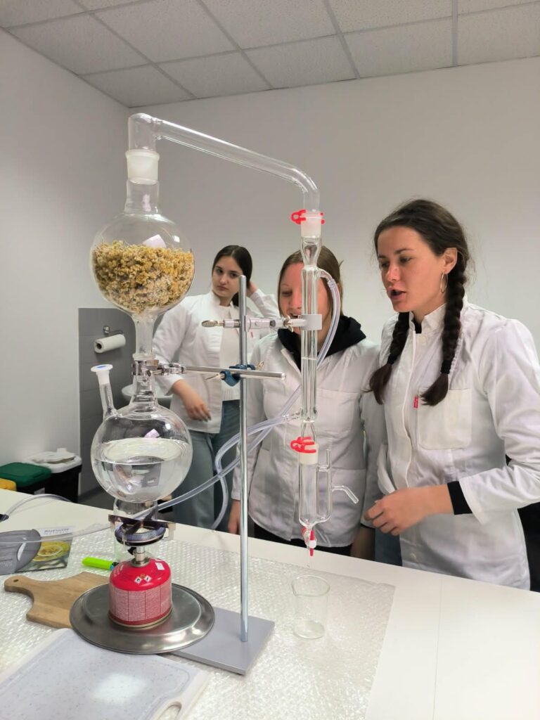 Na VŠ Grm Novo mesto smo skupaj s študenti izvedli destilacijo smilja (Helichrysum italicum), pri čemer smo spoznali postopek parne destilacije za pridobivanje eteričnega olja in hidrolata. Poseben poudarek je bil namenjen vplivu procesnih parametrov na izkoristek ter kakovost končnih produktov, kot tudi pravilnemu ravnanju s surovino in varni uporabi pridobljenih izdelkov.